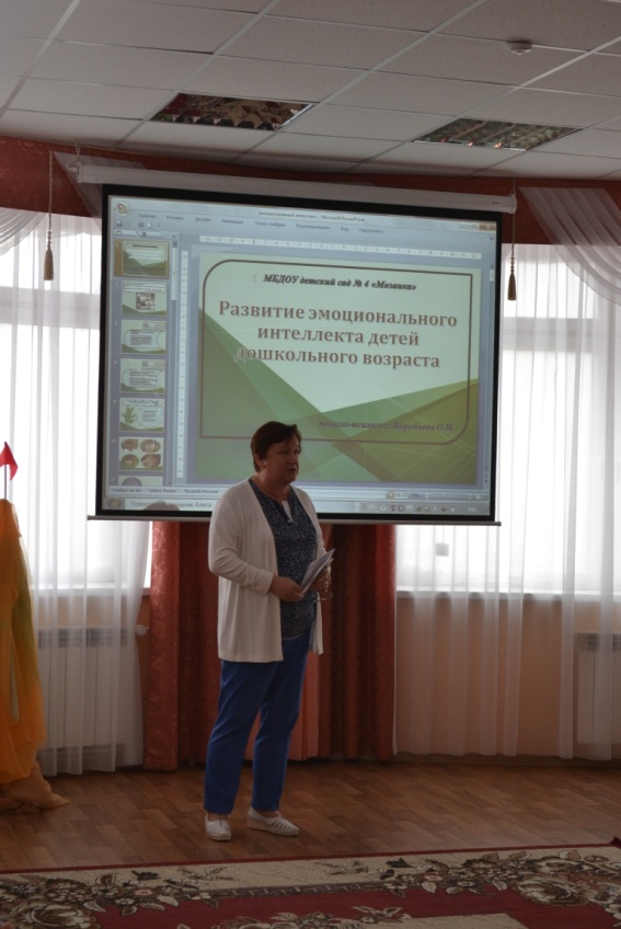 Начался семинар с выступления педагога-психолога нашего детского сада Ольги Николаевны Воробьёвой, которая подняла проблему развития эмоционального интеллекта детей дошкольного возраста и рассказала о программе «Академия Монсиков», которая внедряется в детском саду с октября 2017 года.