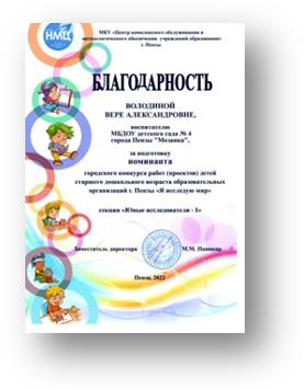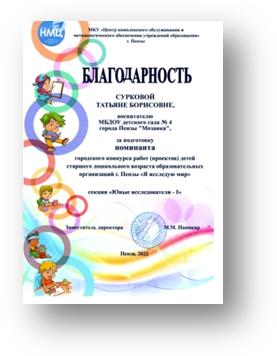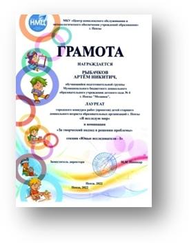 Воспитанники подготовительных к школе групп впервые в этом году поучаствовали в городском конкурсе работ (проектов) детей старшего дошкольного возраста образовательных организаций г. Пензы «Юные исследователи». Это Кобляков Матвей (группа «Непоседы») с названием работы «Откуда берётся кислород?», Кохан Ксения (группа «Веснушки») с работой «Тайны любимого лакомства» и Рыбачков Артём (группа «Умники и умницы») с работой «Живая и мёртвая вода: лгут ли сказки?». Двое были отмечены в номинациях «Юный исследователь природы» и «За творческий подход в решении проблемы».