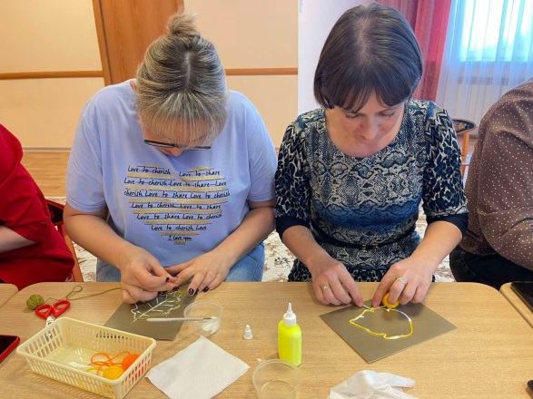 В процессе мастер-класса педагоги выполнили работы в стиле «Ниткографии» — осенний листок. Было очень интересно и познавательно.