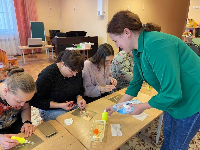 В нашем детском саду прошёл мастер- класс для педагогов по «Ниткографии». Провели его воспитатели Клочкова Ирина Николаевна и Матыскина Вера Алексеевна. Во время мастер- класса педагоги познакомились с историей создания «Ниткографии» и разновидностями изобразительной деятельности с использованием ниток.
