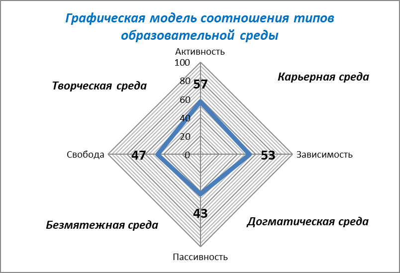 Полученные результаты позволяют характеризовать среду дошкольного образовательного учреждения, в целом, как карьерную. В такой среде недостаточно условий для развития самостоятельности и творчества воспитанников и нет свободы индивидуального профессионального развития педагогов.