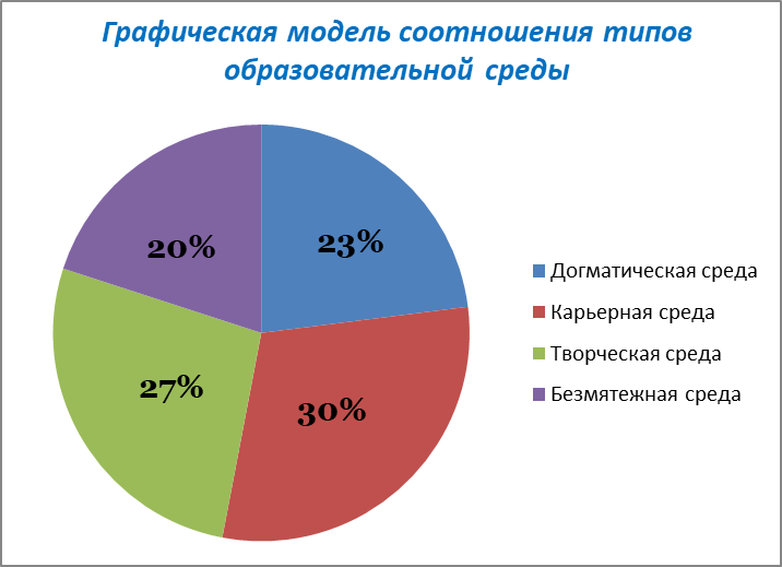 По итогам проведенного исследования по методике векторного моделирования был сделан вывод, что в ДОУ преобладает в основном «карьерная» среда (30%) с большой долей «творческой» среды (27%), с элементами «догматической» (23%) и «безмятежной» (20%).В такой среде недостаточно условий для развития самостоятельности и творчества воспитанников и нет свободы индивидуального профессионального развития педагогов.